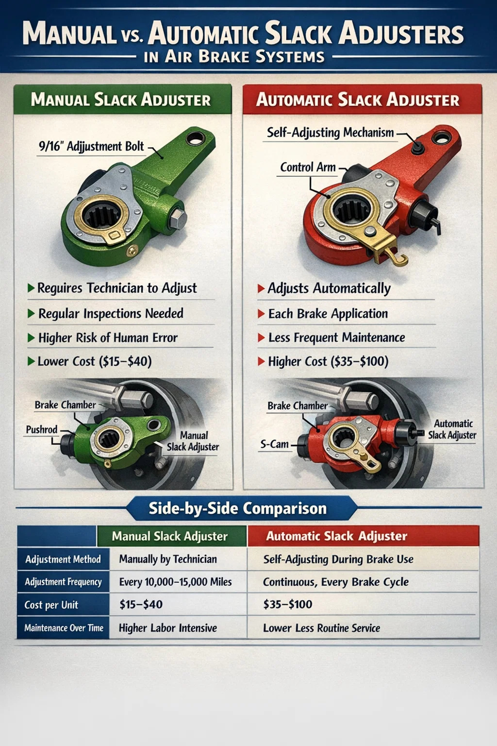 Tabel di bawah ini merangkum perbedaan utama antara slack adjuster manual dan otomatis dalam kategori kinerja dan pemeliharaan yang paling penting: